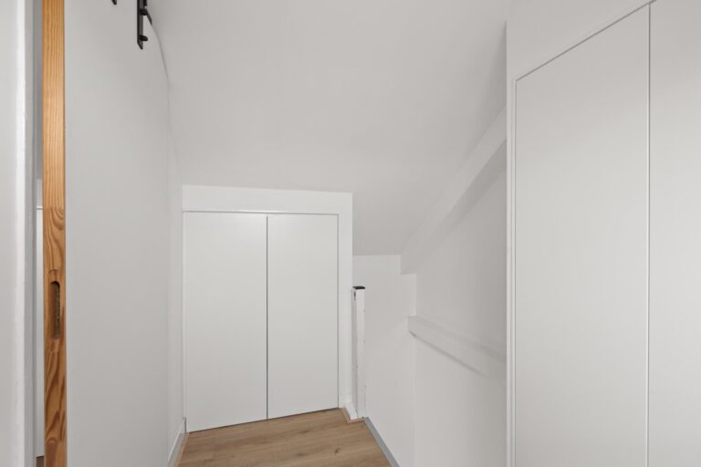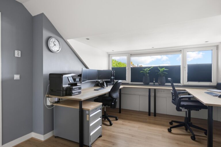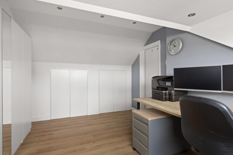 Op de verdiepingen zijn in totaal drie slaapkamers, waarvan één slaapkamer is voorzien van een inloopkast. Deze kamer is ook weer dicht te maken, zodat er een vierde slaapkamer is. Op de overloop is een separate toiletruimte gecreëerd. Op de tweede verdieping is een overloop met veel bergruimte en een handige opstelplaats voor de witgoedaansluitingen. Door de dakkapel is er een ruime kamer ontstaan. Nu in gebruik als kantoor, maar ook prima te gebruiken als slaapkamer. Deze ruimte is eventueel nog uit te breiden met een dakkapel aan de voorzijde.