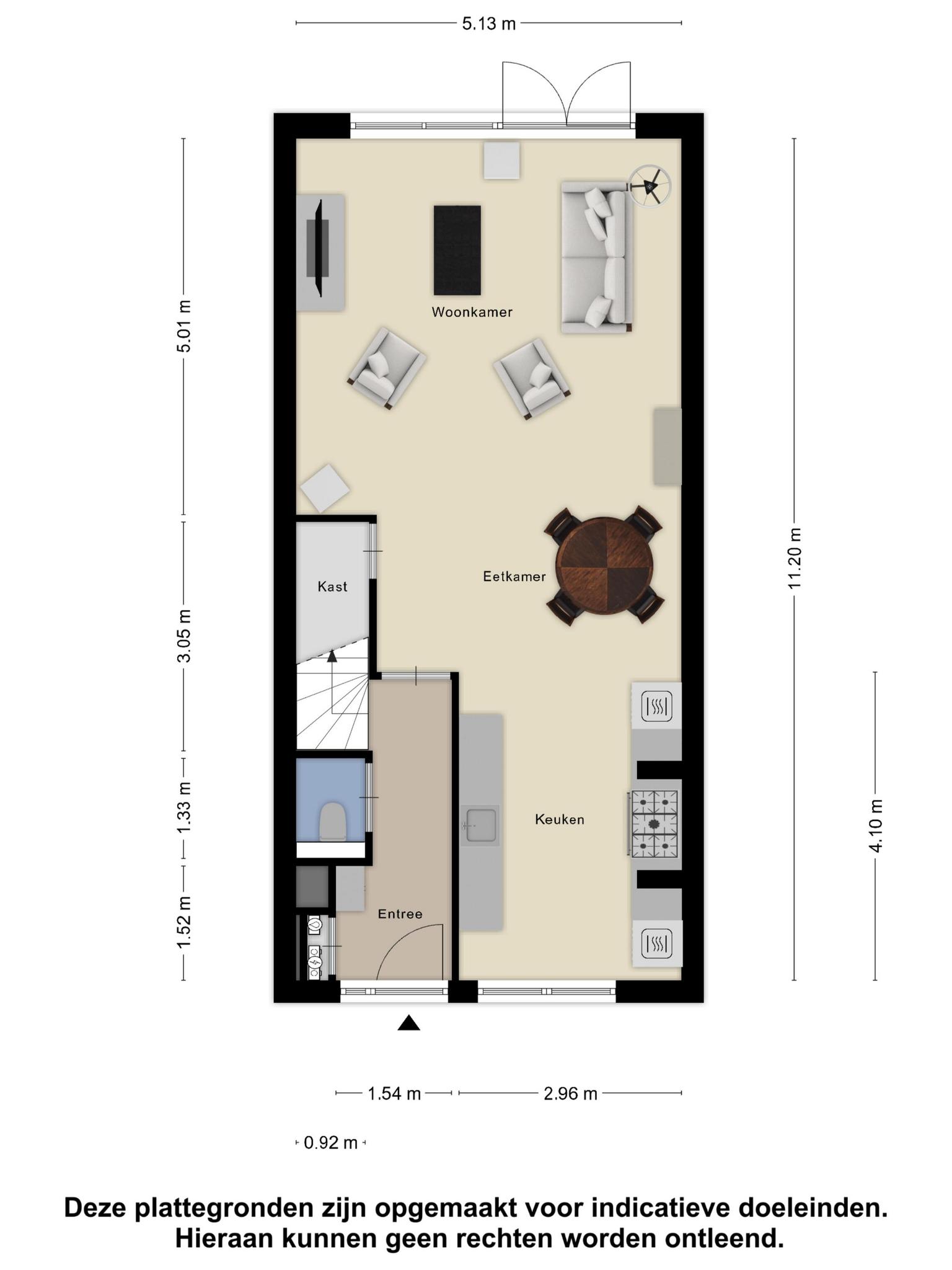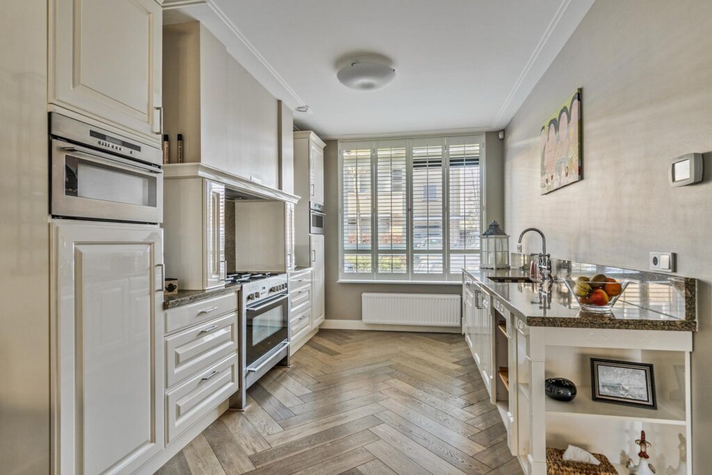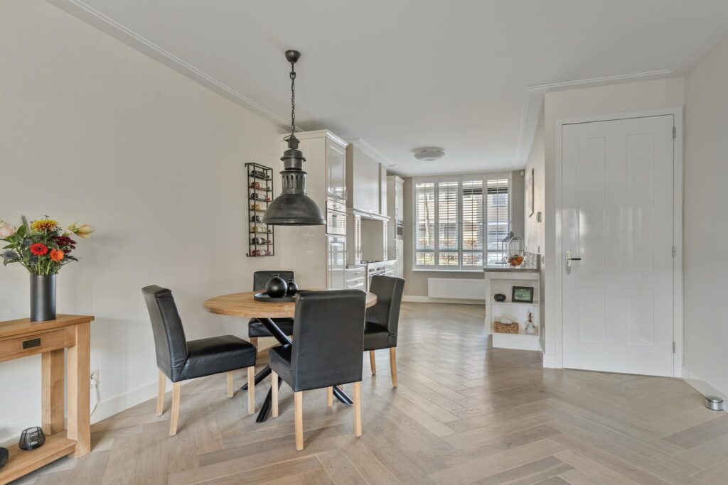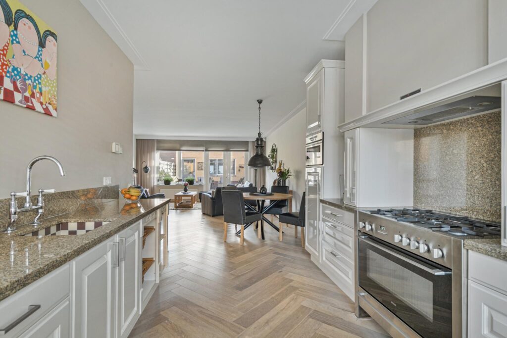 Door de uitbouw op de begane grond is er een zeer royale woonkamer en eetkamer ontstaan. Door de fraaie houten visgraat vloer en de lichte kleurstellingen, is de ruimte direct goed zichtbaar bij binnenkomst. Ook is de woonkamer lekker licht door de grote raampartijen en de openslaande deuren naar de achtertuin. Aan de voorzijde is de open keuken gesitueerd met inbouwapparatuur. De sfeervolle shutters zorgen voor de nodige privacy in de keuken. In de hal is een modern toilet en een ruime garderobe aanwezig.