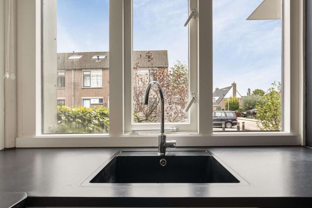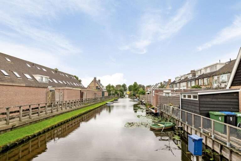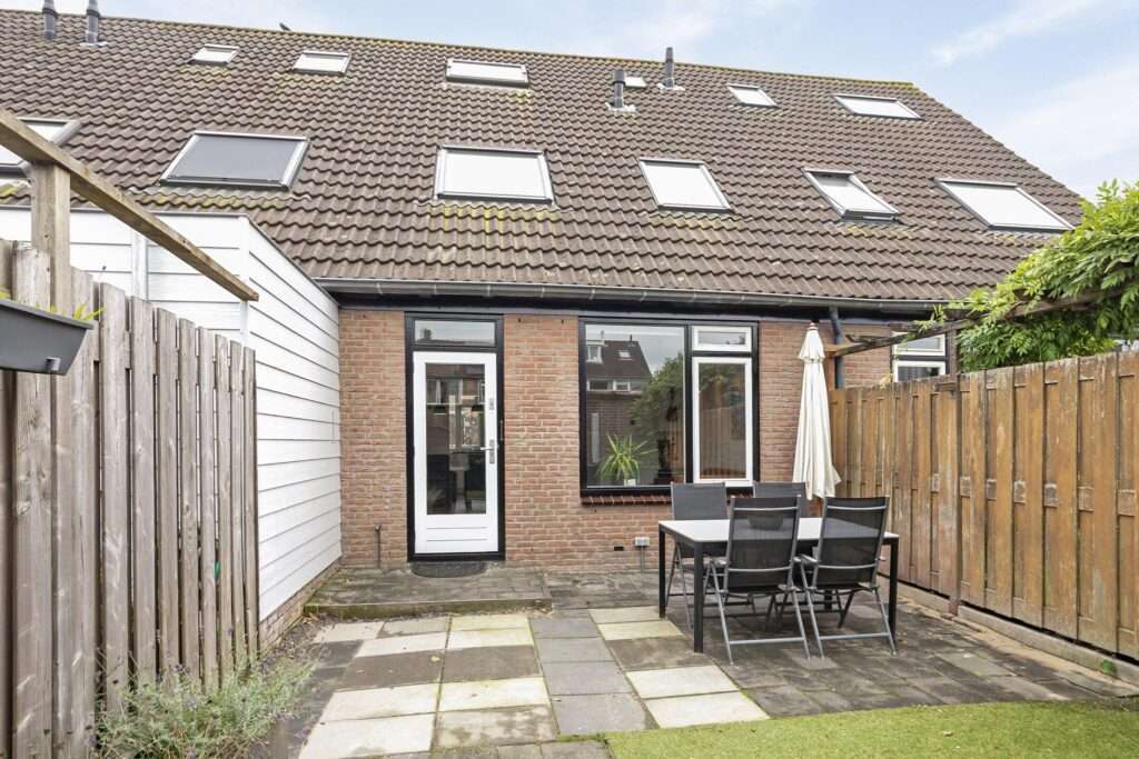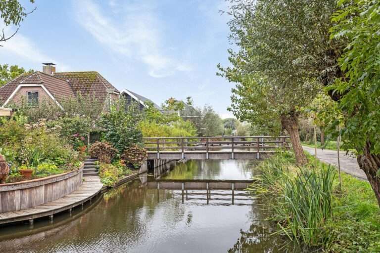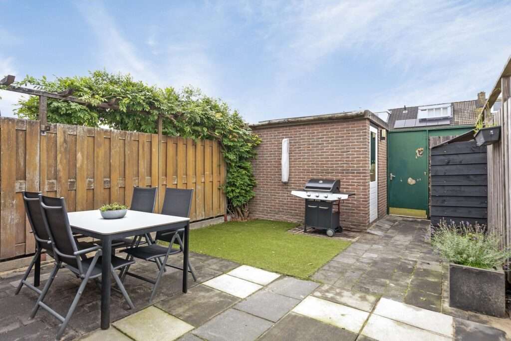 De achtertuin ligt op het noorden en is circa 8 meter diep met achterom. Het is hier lekker rustig door de ligging ten opzichte van andere bebouwing. Als je de poort uit loopt is er een watertje, waardoor je een gevoel van vrijheid ervaart.