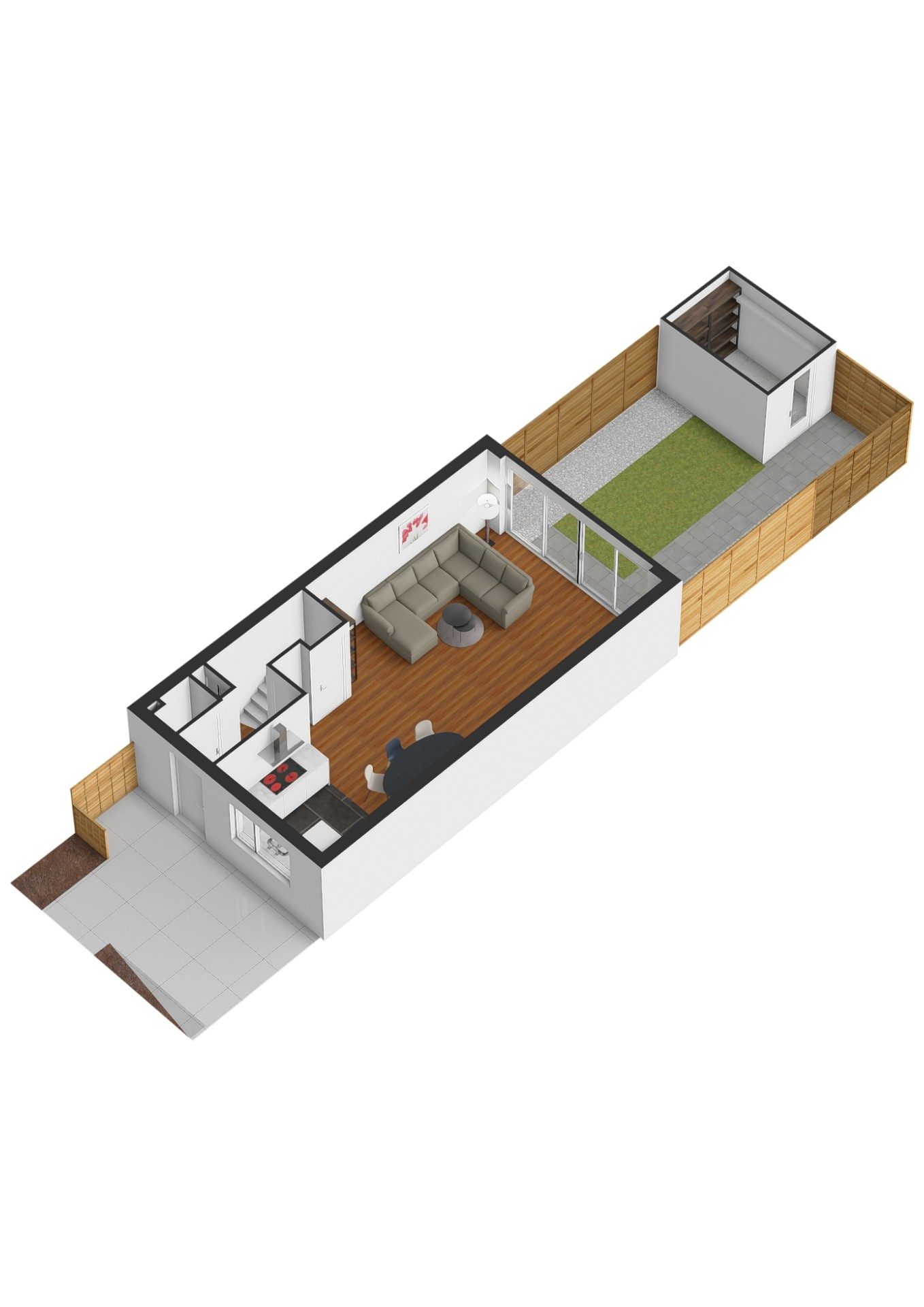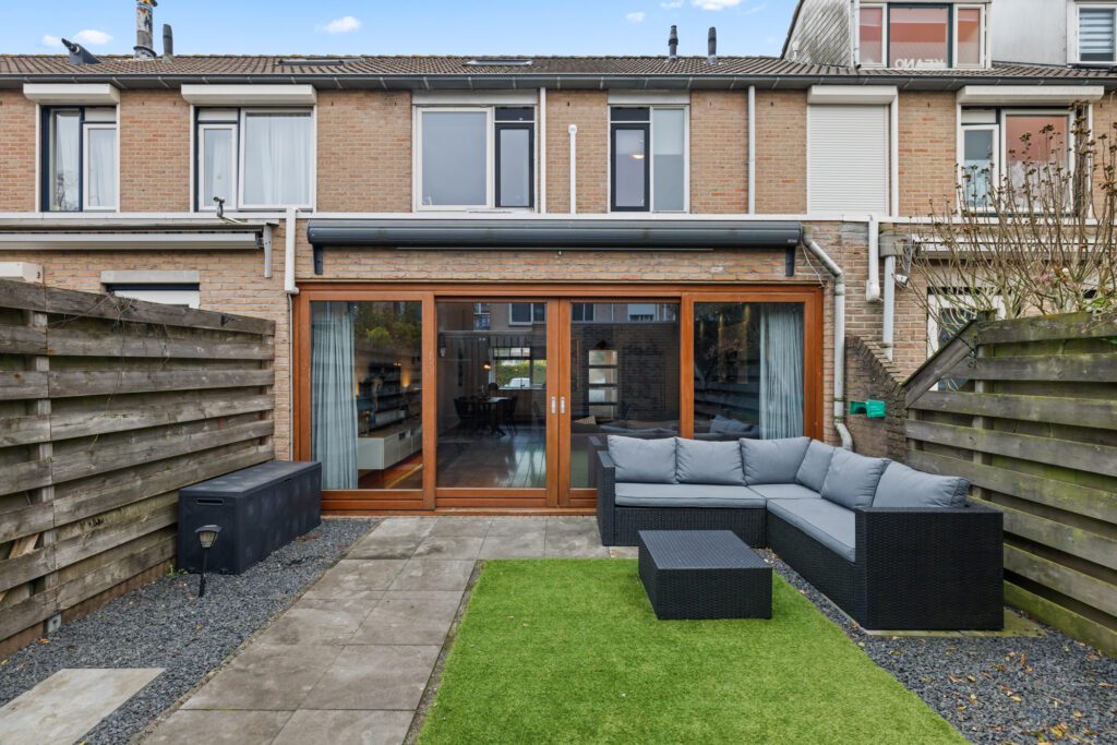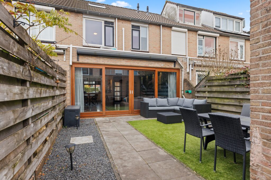 De diepe tuin op het westen maakt het plaatje compleet. Ondanks de uitbouw, is er nog een goede tuin over. Er is een stenen berging voor de nodige bergruimte en een achterom. Hier geniet je zowel in de middag als in de avond van de zon en kun je lekker ontspannen.